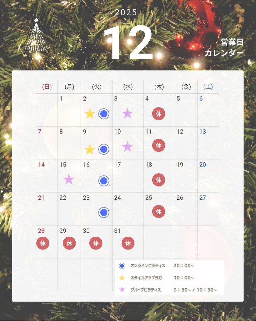 12月オンライン・グループピラティス、ヨガ、定休日予定...