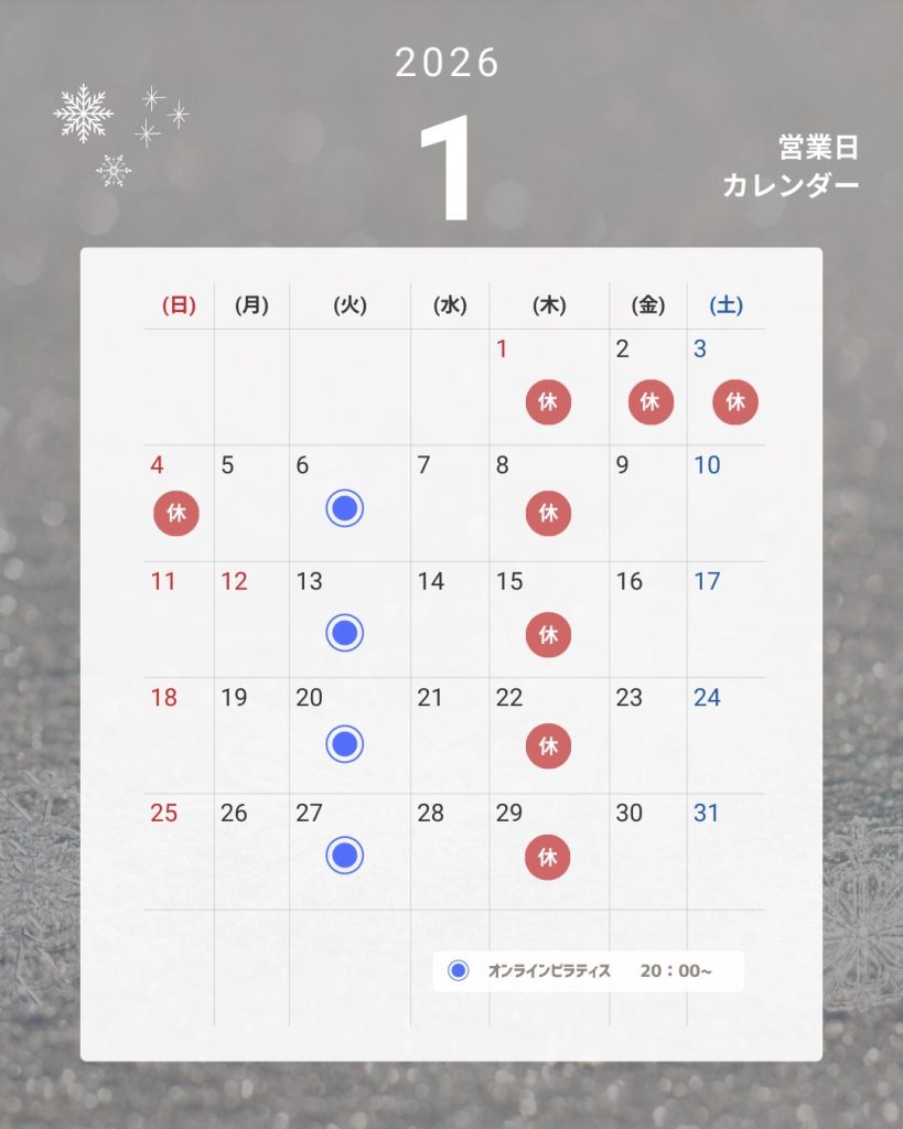 画像では年始休み+木曜日休みとなっておりますが、年始〜1月26日まではプロ野球自主トレのため、基本的にスタジオを貸切させていただいております。